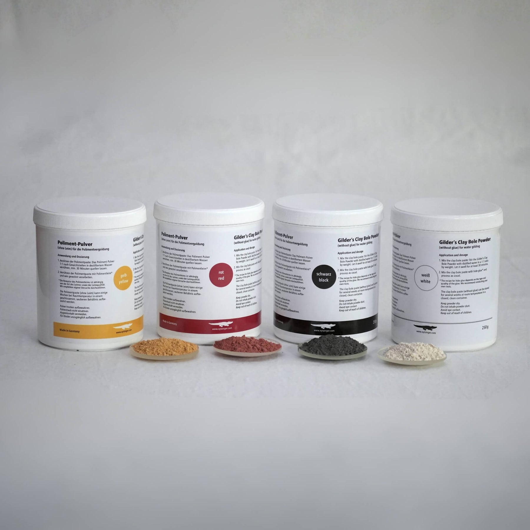 Die Farbtöne vom Polimentpulver entsprechen annähernd den bekannten Farbtönen vom deutschen nassen Poliment. Die Farben Rot, Gelb und Schwarz fallen etwas heller aus. Das Weiß hat einen leichten Gelbstich.